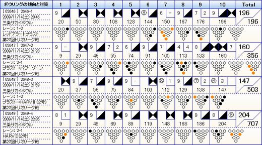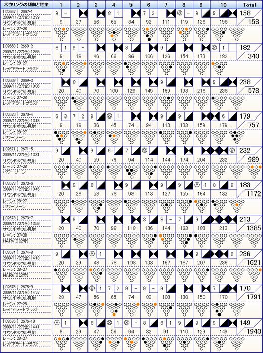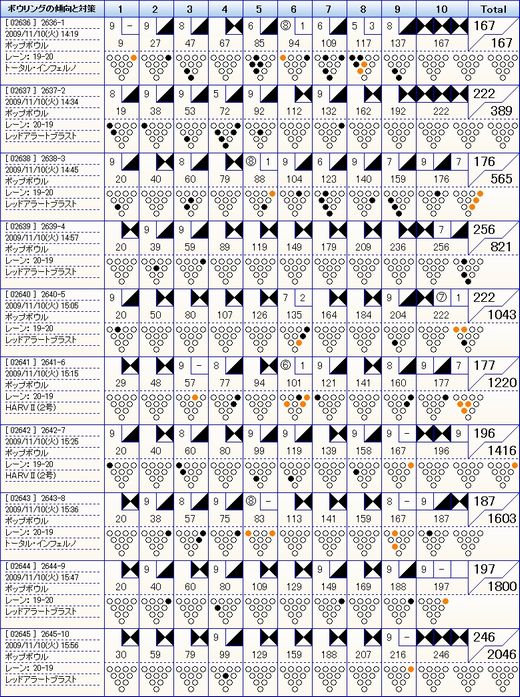 地元センターでのトリオ戦、私はサブに回ったのですが、人手が足りず出場しました。レーンはよりによっての1-2番、ただでさえここは一癖あるのに、なおさら苦手なレーンとなりました。結果は後日205ベースにハンデをつけてから計算するので未確定です。1G目 ブラスト 4thは3個裏、3-10スペアも裏から取り、自分の描いたラインではボールが早く動きすぎポケットに行きませんでした。しかも外は早くノーヘッドも出し放題で早くも気分が滅入ってきました。1962G目 ブラスト→(6フレより)パワーゾーン 10枚目付近が使えないので7フレから大外勝負に出ますが、結果は4本カウントまで出てしまい散々でした。1603G目 ブラスト→HARV2(2号) 左の1番レーンは右より早く、ボールの動きも安定せず、自信を持って投げた球で5番のカバーを外し大ショックを受けました。9フレから投げたHARV2でも早めに動き出し、スプリット2発を喰らい意気消沈しました。1474G目 HARV2(2号) 3G目まででBOX内6人中最下位になってしまい、しかも1フレイージーミス。「もう早く帰りたい」と思っていると、対戦相手トップバッターのEさんが1フレ「G-」の0点を出してしまいました。これには驚き、結構試合にも出ている人でもこんなに悩むレンコンなんだと妙に納得し開き直ってそこからは投げました。2フレも裏でしたが、そこから、右は30枚目立ちの15枚目通し(5枚程出す)、左は28枚目立ちの13枚目通し(5枚程出す)で決め打ちしました。右は滑って甘くなるのを承知で投げ続け、結局このラインではストライクにはなりませんでしたが、7フレは引っ張って内ミスしたのが真ん中に行きストライクになり、これが結果的にやっと最後での200アップに繋がりました。こういうレーンでもエースのA氏はラインを絞ってアベ210台を叩きだしましたし、まだまだ実力差の大きさを痛感しました。ここに通そうとするとなおさら出来なくなってしまう状況はしばらく治りそうもありません。癒しのレーンで再調整してきます。