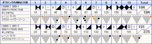 木曜日の不調を見て貰うため堀田プロレッスンを受けました。練習投球を始めると10~12枚目通しが良く、ストライクも続きますがやはりちょっと右手に力が入っている感じで、何故か体が温まる前はラインにピッタリとボールを乗せられました。しかしだんだん引っ張り癖が出始め6番カバーを2回もミスりました。2ゲーム投げたところで堀田プロ登場。見てもらった感想は「ボールを重そうに投げている」「以前より手の振りがコンパクトになり過ぎているので、ボールの重みでゆったり大きく振りましょう!」と言われました。バックスイングが大きくなり過ぎるのを意識し過ぎて、かえって手で誤魔化していたようです。修正後デジカメで撮ったスイングの動画も見せてもらい、バックスイングの高さもちょうど良いことがわかりました4ゲーム目からはレーン移動して(団体さんがいなくなりレーンが空いたので)、二人で1BOXのアメリカンに変更してもらい、時間までしっかり練習しました。最後はストライクチャレンジゲームで、ストライクが出るごとに景品がもらえました。いつもよりは意識しないでストライクは出ましたが、イージーミスをしてしまったのが残念です。ライン 5レーン 25枚目立ちの12枚目通し(チョイ出し)21-22レーン 30枚目立ちの13~15枚目通し(5~10枚しっかり出す)今回も遅かったですが、奥のほうは内にオイルがあったのであまり割れずに済みました。プロの鋭い指摘でまた良い感触が戻りましたが、相変わらず試合で弱さを見せる(競馬で言うところの)調教大将なので、12/3の大会では力まずに投げたいものです。次回大会 12/3 オープン6周年 感謝祭 参加プロ 堀田明子プロ&長谷川真実プロ