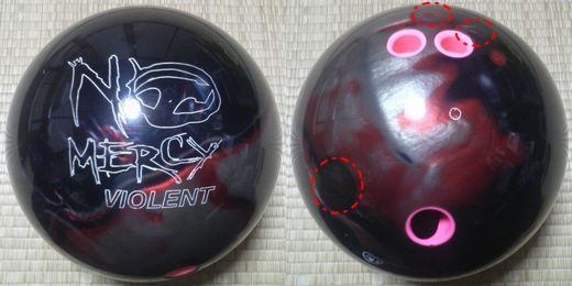 ブラックウィドーHARV2、レッドアラートブラストに次ぐともぞうさんから頂いたボールです。ドリラーのEさんに再ドリルしてもらいました。今までの2個はスパンを縮めただけだったのが、今回はバランスホールを無くし位置も変えてあります(赤点線部分が旧レイアウト)ちょっとローリングトラックにかかっていますが、Eさん曰く最善のドリルだそうです。そうなれば早速、その場(地元センター)で投げてきました。レンコンは外早!、こんな時に外ミスばかりでノーヘッド続出です。最初に歩いて投げて出した裏ストライク2つ以外、なかなか出ません(悲)3ゲーム目までは20枚目立ちの7枚目通しで外目の練習をしますが、ボールは真ん中に吸い込まれて行きました(かといって外ミスすると戻らず)4ゲーム目から左28枚目右25枚目立ちの10枚目通し(チョイ出し)に変え、タイトに攻めました。やっと200アップをしましたがストライクの幅が無いレーンは疲れました。NEWボールはHARV2(2号)より奥で切れる気がしましたが、最終ゲームで2-8残りでピンに負けたり、チョップすると思った2-4-5がそのまますーっと行って取れたりとボールの軌道が今イチ読めませんでした。怪我の功名?として、ノーヘッドの時の2投目は脱力でき思ったところにすんなり投げれました。最初から投げれれば良いのですが、それが出来ないのが私らしいところでしょうか?(苦笑)
