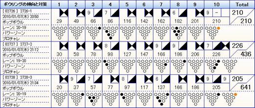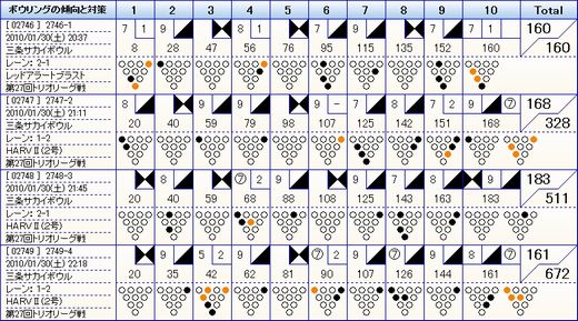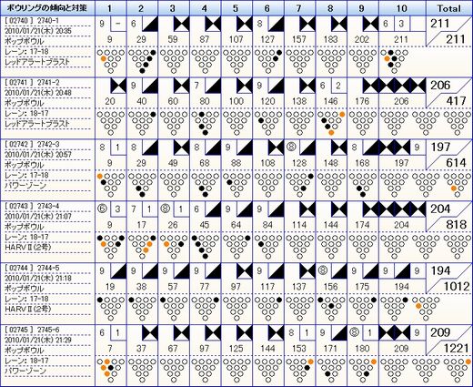 夜に出かける用事が出来たので、それを口実にポップボウルで練習してきました立ち位置20枚目で7枚目通し立ち位置23枚目の10枚目通し1G目 2フレまでは歩き投げのフォーミングアップ、それからストライクが続きましたが、10フレでイージーミス・・・orz2G目 同じボールで連チャンを狙うも、左のレーンで上手く投げれず。3G目 ブラストより奥で切れるパワーゾーンでまたもやストライクが続かず・・・。4G目 HARV2に変えたので、ちょっと外目から投げましたが、それが裏目に出てボールが真ん中に集まりました。ラインを変えた3-6-10もミスり、3連続オープンで涙目です。ここで開き直って内にラインを取り、投げていくと薄目のストライクが続き、100行くかと思っていたスコアも200まで伸びました。5G目 ラインがわかったのでビッグゲームを打とうと思い続けて投げますが、今度は見事なまでに1ピン残りが続きました(苦笑)6G目 最後はもう一度パワーゾーンでビッグゲームを狙いましたが、ストライクの合間にイージーが出て普通のスコアで終わりました。今日はスペアで堅い時はストライクがなかなか出ず、ストライクが続く時はアラが出て最後までビッグゲームが出ませんでした。今日の注意点セット時にボールを体のそばに持つ。打ち頃のレーンだっただけにもっと打ちたかった・・・。