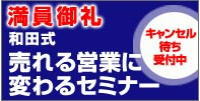 みなさんこんばんは。今日もありがとうございます。ついに本日より、「和田式売れる営業に変わるセミナー」第6期生の募集スタートいたしました!!話し方や時間の使い方やバンドや(?)、いろいろやっている和田ですが、やっぱりそれら全ての根幹にあるのが「営業」。その和田の営業ノウハウをとにかく惜しみなくみなさんにシャワーのように浴びせまくる!そんな超スペシャルセミナー、それが「売れる営業に変わるセミナー」なんです!今回は、遠くて通えない方、6回コースだとなかなか都合が合わない方の熱いご要望にお答えして、今まで6日間でやっていたものをぎゅーーーーーーーっと2日間に凝縮して行います!1年に1回のこのチャンス、ちょっとでも「行ってみたいな」と思ったら、ぜひチャンスの神さまの前髪、つかんでくださいね。「和田式売れる営業に変わるセミナー」あ!セミナーページリンクを押す前にこちら(↓)のリンクをクリックお願いします!「押したら売れる営業に変わるかもしれない人気blogランキング」(いや、たぶん変わりませんが、毎日押すことで継続力がついて長い目で見れば役に立つかもしれません?)