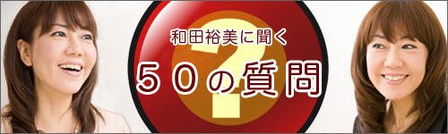 みなさんこんばんは。今日もありがとうございます。きのうのあやさんのコメントで気づきました^^;以前みなさんに追加質問募集しました「和田裕美への50の質問」、質問&回答を+10個アップしました!最初の10個、「New」の表示があるのが追加分です。このブログからみなさんにいただいたご質問もいくつも採用されてまーす^^個人的には、Q10が相当笑えました。さ、いますぐチェックしてみてください。 ↓↓↓ ↓↓↓「和田裕美への50の質問」和田裕美への質問は、随時受けつけております。また更新していきますので、ぜひぜひコメントに書いてくださいね★----------- <おしらせ> -----------------私、明日より来週火曜まで夏休みをいただきます。もちろん「毎営業日更新」の裏WADAブログはお休みしません(^^)vが、事前に書いたものを他のスタッフにアップしてもらう形ですので、コメントのお返事はまとめて水曜にさせていただきますことお許しください。-------------------------------------------- いつもありがとうございます。ぜひ今日も「ぽち」お願いします。(人気blogランキング)