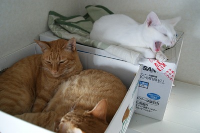 今日は快晴で日差しもたっぷりあって、暖かい一日でした最高気温も約12℃まであがったので、窓ガラスから入る陽光で2階のお部屋はぽかぽかになりました。昨日だって最高気温は 9.4℃あったのです。でも昨日は空が灰色の雲に覆われ、日差しがなくて空気が冷たい一日でした。頼みのお日様がないと、2階の部屋は寒いのです。たまらず昼間でも暖房を少し入れましたが。我が家は2階でもお向かい宅から見えることもないので、昼間はカーテンは閉める必要はありません。カーテンを開けた窓ガラスからは冬のお日様がさんさんと降り注ぎ、お日様パワーで2階は暖房なしで&照明なしで過ごせます。せっかくのお日様だから、省エネしなくちゃね。こんな日は、我が家の動物さんたちも気持ちよさそうです。人間とは比較にならないほど、自然の変化に敏感でしょうね。「ねえ、お兄ちゃん、お日様がないときって、寒いのね。」朝晩とか昼間でも寒いときは、こうしてみんにゃで猫団子になってます。そして今日のように暖かいときは、できるだけ布団をお日様に当ててます。部屋の中で掛け布団を温めようと思ったら、チビ子嬢に占領されて布団がぺったんこになってしまいました。昼間に十分お布団を干せたときは、生地がさらさらでふんわりするので、みんにゃ気持ちよさそうです。リリーちゃん : 「ねえ、小太郎兄ちゃん、康太郎兄ちゃんは寝不足なの?」小太郎 : 「ちがうよ、リリー。 お布団が気持ちよくて、ぐっすり寝ているんだよ。」康太郎君、ホントに気持ち良さそうです。可愛いみんにゃの幸せそうな顔を見ると、私も嬉しくなります