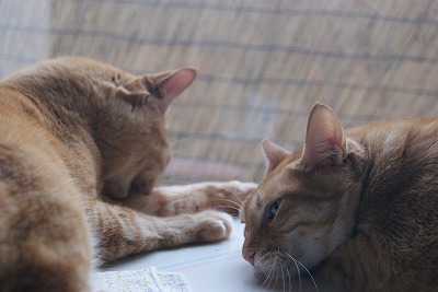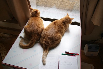 今日は10月10日で、一昔前なら 『体育の日』 でした。ハッピーマンデーに慣れてしまった方には、今日の日は 「いつものふつうの平日」 でしょうね。でも私は昔の祝日の、「週の半ばに突然くる休日」 がけっこう好きだったので、少々物足りない感じもあります。さて、今日は全国的に10月とは思えない暑さでしたこちらのエリアでは最高気温が約31℃まで上がりました昨日の新潟県糸魚川市の35℃ みたいな信じ難い数値ではないものの、やはり暑かったです。お天道様のことは、人間ではどうにもなりませんね。ここしばらく続いていた私の忙しい日々も、今日の夕方、やっとひと段落しました。家でやることが終わった瞬間、思わず 「やった~」 なんて叫んじゃいましたよ。ふだん、ついダラダラしちゃう私なので、たまにはこういう時間もいいものですね。そして、そんな忙しい時間の中、私の可愛い “癒し隊” は、私のために日々 “任務(=私を癒すこと)” に励みました。テーブルにノートを広げて課題をやっていると、小太郎と康太郎がやってきて、ドスンと座り込みます。まずどちらか片方がやってきて、必ず後からもう片方がやってくるのです。邪魔だけど・・・可愛いです。康太郎(奥の子)の、ちょんとかけたお手々が可愛い。窓の外をふたりで一緒に眺めて、何を思っているのでしょうか。赤ニャンのときに我が家にやってきて、もう8歳半です。すっかり大きくなって・・・でも愛らしさはずっと変わらずですただ正直ふたりが邪魔なので、このあと私は別のテーブルで作業を続けました。