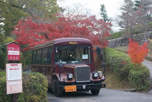 先日、愛知県犬山市にある 明治村 に行ってきました。私の明治村の村民証(年間パスポート)の更新が11月で、もう何度も行っている場所だけど、村民証が切れると困ることもあるので、毎年更新しています。お天気はあいにくの曇り空でした。でも最近は家でいろいろやることが多くて、行けるときに行っておかないと期限が切れてしまうので、さっと往復してきました。11月後半の明治村は、こんな景色になってます。今回UPしたのは、画像をクリックすると大きくなります。村内を走るバスです。明治村の中はけっこう広いし坂も多いので、バスの一日乗車券を買って利用するのもいいかも。 明治村の中でも人気スポットの、5丁目の 『聖ザビエル天主堂』 です。教会の中はクリスマス仕様になっていました。 2丁目まで来たときに、ちょうど村内の市電がやってきました。 2丁目の奥のほうにある 『清水医院』 の建物です。紅葉の葉が真っ赤になっていました。 2丁目の入り口にある 『京都七条巡査派出所』 です。村内のお巡りさんは、気軽に記念撮影に応じてくれます。