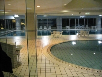 写真はツインタワー石打の5F温水プール。ガラス1枚向こうはゲレンデだ。