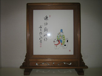 犬の上には福の神がまたがっているというおめでたい絵と書は、前大徳明道氏のものです。