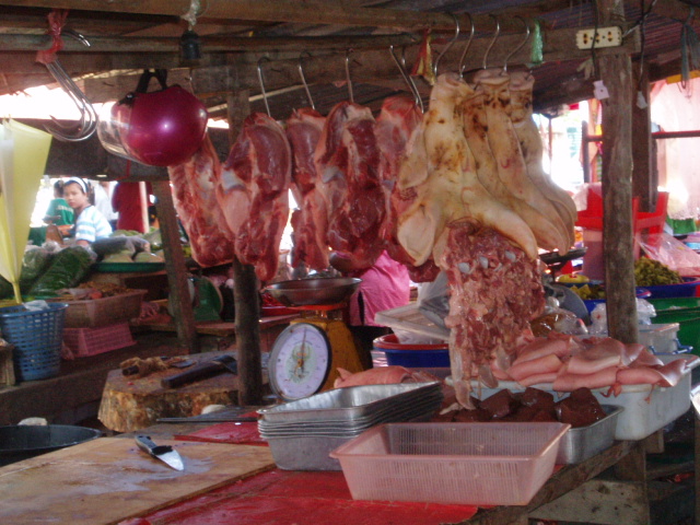 今日は市場の日 私が今すんで居る所は月、水、土曜日の週3回市場が開きます。 初めて行った時はビックリ鶏が丸ごと羽をむしられて下がっている 豚の顔だけとか、シッポとかグロテスク 豚肉売り場の様子 奥の方に豚の顔が見えます。 黄色い鶏 解りますか?この黄色い鶏すごく濃厚なスープが取れます 肉はやや固め。 氷の引いた上に魚を並べています 生では食べれません 大丈夫と言われても怖い! ここは貝類が並んでいます 私はこのムール貝のハーブを使って蒸した料理が大好きです。 慣れるまでに少し時間がかかりました なんせ独特の臭いもあり吐きそうになった事も しかし今は慣れましたそんなこんなでタイ人化していく私しです