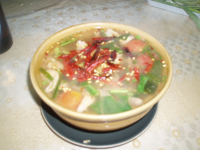 プーケット今日も快晴! 昨日、一昨日と食べ物系が続きしかし今日も懲りずに食べ物で 私しは辛いものが大好き!昨夜はどおしても火が吹くほど辛い物が食べたくてトムヤムムー を頼みました 辛くして(ペッ ペッ・・・)と言った所このスープが出て来ました 唐辛子10本以上は入っていましたよ~ 期待通りチョ~辛くて美味し~い ここはソムタム屋さんなのでお約束のソムタムタイを頼みました これも辛くて 本当はビアシンが飲みたかったのですが今日はチャンしか無いと言われ、久々にチャンを 飲みましたがやはり度数が高い一本飲みきれませんでした