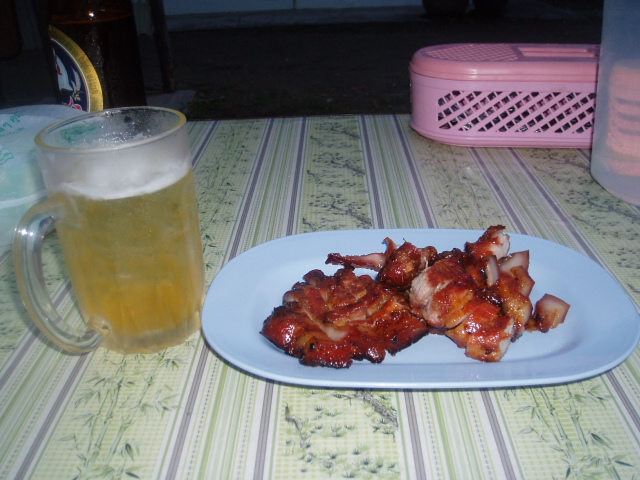 今日は朝から曇り空 風も無く昨夜かなりの雨が降った様です。 ハイシーズに入りプーケットもファランであふれかえっています、観光地やホテルに行くと 此処がタイと言う事を忘れてしまいそうになるぐらいファランだらけです 話しは変わり昨夜は久びさにイサン料理が食べたくなり、近くの屋台に行きました。 ここは以前良く行った屋台です、タイに来て外での一人ご飯も此処が最初の所です。 あぶり焼きのタレが濃厚で私はとても好きです 鶏のもも肉に甘いタレを付けて墨であぶり焼きしたものです(ガイヤ-ング) オレンジがかったスープは中に豚の内臓系が入っています、味は少し酸っぱくあっさり していて私しはとてもスキです、辛くしてと頼んだのでスープの色がオレンジになって いますが、本当はもっととんこつスープの様な色です。 隣にあるのがもち米の炊いたもの(カーオ二アオ)手で小さく丸めて食べます。 そして今回食べたかったムーサテ何でかと言うと此処の屋台で最近始めたメニューです。 他では食べた事がありますが、期待通り美味しかったです このムーサテなんと10本で20バーツ日本円で60円チョット そして気になる今夜の合計値段は、〆て90バーツなんと300円行かない、此処の 屋台はビールが置いてないので持込OKビールを持ち込み昨夜は400円以下で大満足