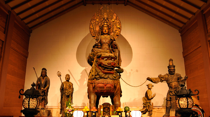 獅子に乗った文殊菩薩像は高さ7mにもなり、日本最大の文殊様でもある。
