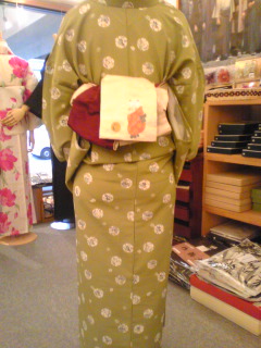 同僚のお誘いに着物を着てのお出かけをやってみました。着物・・・持っていない私は上から下までお借りして今日は日本の女に変身ですグリーンの着物・・素敵なものでした