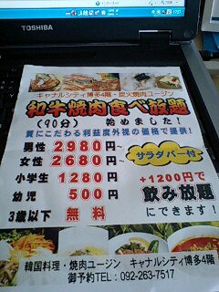 キャナルシティー博多に行ってきた。4階の和食店 「なごみの里」でご飯。残念ながら、写真は撮るの忘れていたけど、蕎麦の定食をいただきました去年まで、私も働いていたお店。お隣の焼肉やサンの ご案内。。今の季節は、焼肉食べ放題をしています。。。いいお肉たくさん出しています今日は、和食でしたが、今度は焼肉・・・・
