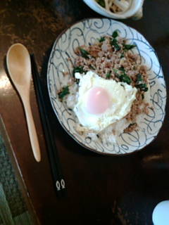 バジルと生姜と豚挽き肉の炒めと半熟目玉焼きがご飯に乗ってます。
