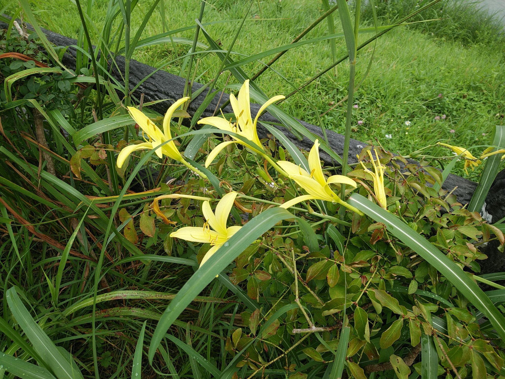ゆうすげの花やらススキの穂が出ていて晩夏の景色。
