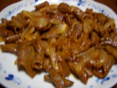 ホルモン焼き 豚のホルモンを玉葱と一緒に味噌味で炒めたもの七味唐辛子をかけて食べると最高です