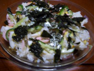 ちらし寿司 きゅうり、薄焼き卵、ハム、ちくわなどを入れる、とても安上がりなちらし寿司だけど味は最高です