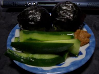 おにぎりとモロキュウ この時期野菜はいろいろな人から頂けるので、野菜が我が家にはいっぱいあるのでモロキュウを夜食に出してくれる