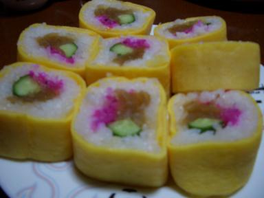 卵の巻き寿司 薄い卵焼きにかんぴょう、紅生姜、きゅうりで巻いた寿司蒟蒻の刺身 夏になるとこれがよく食卓に出てきます辛子酢味噌でたべます最高~
