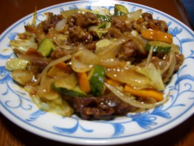 酢豚風野菜と豚肉炒め 胡瓜が入ってるし肉の形は違うけど肉が酢豚みたいに炒める前に揚げた(表現はこれでいいかな?)みたいだから酢豚風と名前を付けましたご飯がすすみました