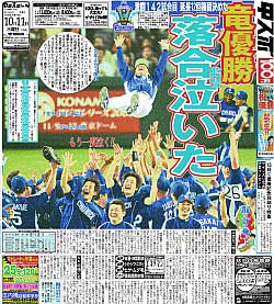 11日付のスポーツ新聞一面は全てドラゴンズ 今朝(11日付)のスポーツ新聞は、朝ずば!とかでもご存知の通り一面は全紙ドラゴンズの落合監督の胴上げという歴史的な日になった^^今までは中日が優勝してもドラゴンズの親会社の中スポ(東京ではトウチュウ)ぐらいで、どこも取り上げなかったけど今回は監督の涙や他に重大なスポーツネタがなかったのかな?理由は何にしろ嬉しい^^特に報知やデイリーまでもが一面にしてくれたのが嬉しい