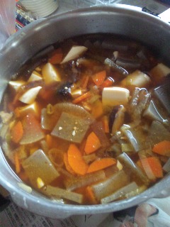 ニンジン・大根・賞味期限の少し切れたこんにゃく・ネギ・乾燥しいたけ・豆腐で、肉なし豚汁もどき。お酒が残り少ないため焼酎と味噌・醤油で味付け。微妙な味‥