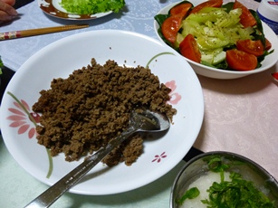 今日は母の日で~~ けーやんが夕ごはんを作ってくれました。 ナニ?これ・・・? ハンバーグのつもりがまとまらんくて バラバラになってもた・・・ 材料は間違いなく入れたというけど、 なら、なんでまとまらへんのよぉ~~ けーやんの年を知ってる人はびっくりするだろうけど、 ま、お料理は幼稚園児並なので・・・ で、これをどうやって食べるか・・・ 仕方がないので、ベランダのレタスを摘んできて 包んで食べました・・・ おろしハンバーグのつもりで、大根おろしを作っていましたが、 これはポン酢で食べました・・・ 実は、天燈上げで書いた願い事は 「けーやんが早く嫁に行ってくれますように・・・」だった。 これじゃ、嫁になんて行けへんわ・・・ と暗澹とした気分でいたら、 「はーい!プレゼント!!」 (料理の失敗など、全然苦にしてないから、明るい声で) こんなのをプレゼントしてくれた。 嬉しいような、悲しいような・・・ 複雑な「母の日」でした~~