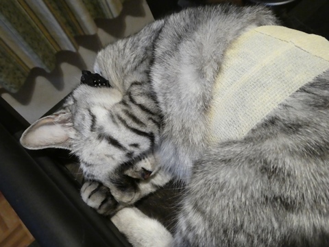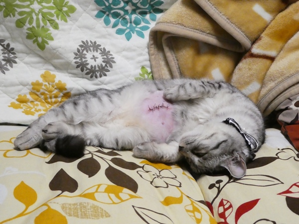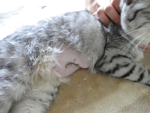 今日の10時から手術のハズが、朝の断食を忘れて餌をやってしまい・・・でも、一掴みの半分くらいしか食べてないから、 「ま、いいでしょ~、30分遅れの10時半に連れて来てください」とのこと。事前にいろんな検査をやると思いきや、当日に検査、手術とすべて済ませて7時過ぎに戻ってきました。ムチャおとなしいです・・・鳴き声も弱々しい~~う~~ん、人間の都合で手術させちゃったみたいで心苦しい・・・なんか恨めしそう・・・でもシニアになって、筋腫やしこりができるリスクは多少避けられるので、悪く思うな、ミャーコよ・・・毛刈り・・・でもちょびのときはおなかのところ、ぐるぐる巻きにされてたのに、ミャーコは絆創膏が貼ってあるだけ。明日、けーやんが消毒に連れて行きます。1週間後に抜糸。ちょっとの間に、げっそり痩せて戻ってきたミャーコでした・・・