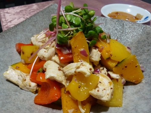 狭いベランダで採れた野菜でお料理。採れたて、というだけの珍しさ・・・全部が色づくわけではなく、少しづつ色づいてくる。全部が色づくころにはヒヨドリにやられるので、早めに採っちゃう~~細く切ったキュウリとプチトマト、薄焼き卵やハムを入れて三杯酢にごま油を少しいれて、中華風の酢の物。今日は休日に作っていたハンバーグを解凍して、おろしハンバーグハンバーグが敷いてあるデカい青ジソもベランダ産ホウレンソウに見えるお浸しは スイスチャード。茎が黄色と、赤の種類を育てています。狭いベランダで育てている野菜たちで、結構役にたっています。もうすぐシシトウも採れる頃になりました。