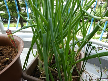 去年かのんオーレさんからいただいたやぐらネギが今年の春ごろから結構薬味として役に立ってくれてそろそろ、子ネギを植えようかなぁ~と思っています。子ネギって葱の先っぽについたコレ去年、かのんオーレさんにこれと同じものをもらって、うまく根付いてくれたというわけ。らっきょみたいに膨らんでいるところを、ポロっと取って土に植えとくとすぐに根付くから、今回はこの子ネギをhiromiさんちにお嫁に出すことにしました。ちゃんとお役目、果たしてね、子ネギちゃんたち。で、今朝のベランダは・・・昨日に引き続き、また曲がったきゅうり。お水がちょっと足りないのかな・・・雨にあたったせいか、トマトが裂果・・・スイスチャードのこれって、どこが花なんだろ・・・?どうもこの塊のまま茶色くなって、7月ごろ種として採種できるらしい。毎朝、ベランダに出て様子を見るの、楽しいけどミャーコまで一緒に出て、そのプランターの上を歩き回ったり、汚い足のまま部屋に入ってきたりするので、困っとります・・・