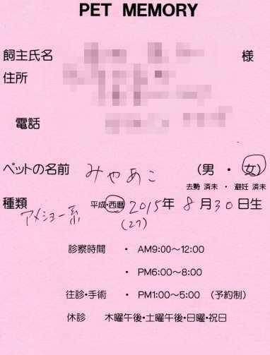 あの鳴き声はもう我慢できないので、今日、動物病院へ連れて行ってきました。で、まだワクチンが済んでいなかったので、今日はその接種も。ちょっと高齢のお医者さん・・・ミャーコなんですけど、「みゃあこ」になっていました。雑種なのに「アメショー系」って書かれていました。ミャーコは完全「サバトラ猫」なんだけど・・・ま、似たようなもんだからいいけどね。保護したのが10月7日「生後1か月ちょっと・・・ってところかなぁ~8月30日生まれにしとこか・・・」こんな具合でミャーコの生年月日は2015年8月30日と獣医さんが決めてくださいました「で、先生、今日はおいくらですか?」「・・・じゃ、5000円・・」毎回、こういういい方なのでいつも心の中で突っ込んでる・・・じゃ・・・ぁ?じゃーってなに?なんか、テキトーに値段決めてる?けーやんが連れてきたら4500円くらいになってるとか・・・?その「じゃ・・・」が気になるわぁ~~アメショー系の猫。帰ってきて疲れたのか、ぐったりと寝ていました。でも時々、例の鳴き声で私を悩ませるぅ~~来週の金曜日に手術してきます。そのころには鳴き声も治まってるかも・・・発情期って1週間くらいらしいから。