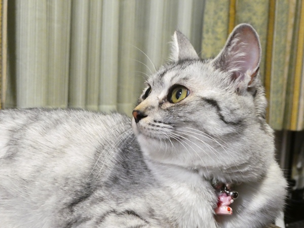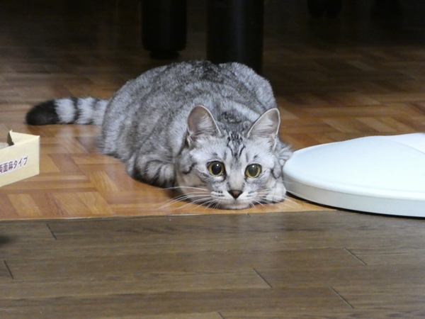 我が家に来て8か月、生後9か月くらいと思われるミャーコ最近は自分の欲求を人間様に訴えるようになった。それも私じゃなく、けーやんに・・・けーやんが帰ってくると、ネズミのおもちゃを持って「ミャ~オ、ミャ~オ!(遊ぼうぜ~)」 と誘いをかける。知らん顔してると、洗面所からトイレから、ずっとついて歩く。猫はハンターだから、生まれついての本能の血が騒ぐんだろうね。隠れて、待ち伏せして飛びかかる!あまりにも長い時間隠れてると、ネズミを持ったままけーやんが疲れて眠ってる・・・するとミャーコが物陰から出てきて「みゃ~お!みゃ~お!(ナニ居眠ってんねん!しっかりネズミ動かさんかぃ!」とけーやんに向かって抗議する。昼間眠って夜活動するミャーコには、私もけーやんも付き合いきれません・・・朝も早いからねぇ~~ニャンコって・・・相変わらず、もっちゃりとした顔つきです・・・