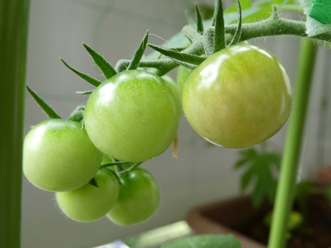 プチトマトがだんだん大きく育ってきた。 一斉に色づかないね・・・ こういうもんなんだろうか。全部が色づくまで置いておくの? でも、色づいたものからヒヨたちに狙われるから・・・ ちょっと色づいたものはラップをかぶせて、つつかれないようにした! そのカイがあって、今日 ちょっと皮は固いけど、中の実はムチャ甘い!!ほかのも早く色づいてほしいなぁ~~毎日プチトマトを食べてる遊星家自給自足できたらいいなぁ~来年は10本くらい植えてやろうかなぁ...洗濯物が干せないけど・・・