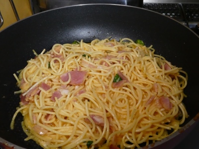 パスタの茹でたのが残った時、こんなのはどう~? 茹でたパスタは固まらないようにオリーブオイルをまぶしておきます。 それをボールに入れてキッチンばさみでチョキチョキ切って~その中に、細切りベーコン、粉チーズ、卵、塩コショーを入れてグルグルかき混ぜて オリーブオイルを引いたフライパンで丸く焼きます~ベランダのバジルもちぎって入れました。 ひっくり返しまーす! あっ!こんなところに・・・飛んだ!! もう一回ひっくり返して、両面、パリパリに焼きまーす! 6分割に切ってケチャップを塗りまして~断面 タバスコをかけるともっと美味しい~ 実はこの茹でパスタは前日の残り物で、これがあることをすっかり忘れて、仕事に行く前にこんなのを作ってた!茄子とガンモの煮びたし。しっくり合わない献立になりました・・・