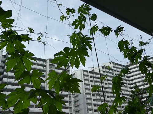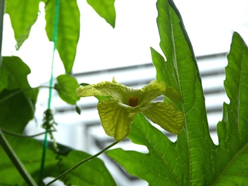 5月初めにプランターに定植したゴーヤもこんなに葉っぱが茂ってきて、雄花のつぼみがどんどんついてきて、雌花も初めて花が開いた・・・と思ったら、雄花が1つも咲いてなくて、受粉できず・・・かわいそうだけど、出会いがなく枯れていく運命・・・でも、新たに2つ、雌花発見!この子たちが花開くときに雄花が咲いてるといいなぁ~~