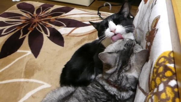 仲の良いミャーコとぐんちゃん。時々こんなふうにグルーミングし合ってることも。お互い心を許し合ってるってるのがわかってほのぼのとします音楽が流れます(音量にご注意)