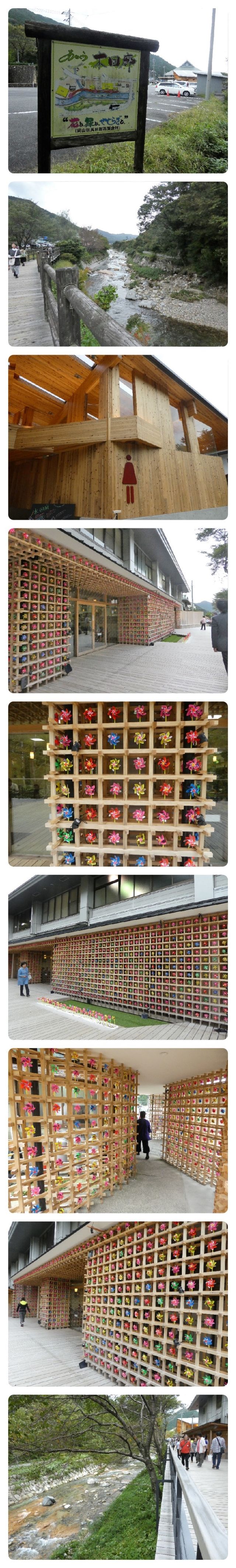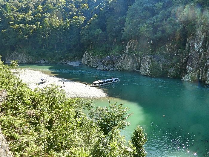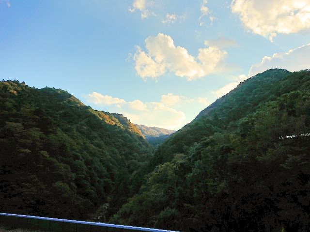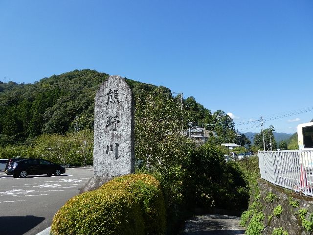 もう2週間も前になる瀞峡(どろきょう)めぐり9月はお天気が不安定だったけど、この日は朝からいいお天気で、日焼けが気になるほどでした。谷瀬のつり橋から熊野本宮大社へ行き、昼食の後、北山川の渓谷、この瀞峡へ。あのウォータージェットに乗ります。こんにちは~~ お邪魔します・・・こんな渓谷を船で巡っていきます。後でこのつり橋を渡ります~~台風や豪雨の時は、この橋のすぐ下まで水が流れるそうです・・・こんなウォータージェット船で巡りました。約20分ほどの瀞峡巡りが終わって、いよいよ、向こうに見えている山彦橋を渡ります。ここから「ヤッホー!」と叫ぶときれいにやまびこが返してくれるので「山彦橋」と名前が付いたとか。全長は谷瀬のつり橋よりもう少し短くて、100m弱かな?三重県と奈良県の県境にかかるつり橋だそうです。谷瀬のつり橋より、ユラユラ感はマシです。板もすこし安心感があります。下をのぞけばこんな感じです。つり橋からの眺めはとても気持ちよくて、景色もきれいでした。ツキノワグマがでるらしい・・・渡るのが目的なので、渡り切ったらもどりましょうかね。・・名残惜しそうに瀞峡の風景をもう一度見る。気が付くと、目の前に昭和か大正かと思うようなホテルが・・・2週間前はちょうど彼岸花の季節でした。熊野は美しい川と山からなる、自然がいっぱいの心癒されるところでした。おしまい・・・