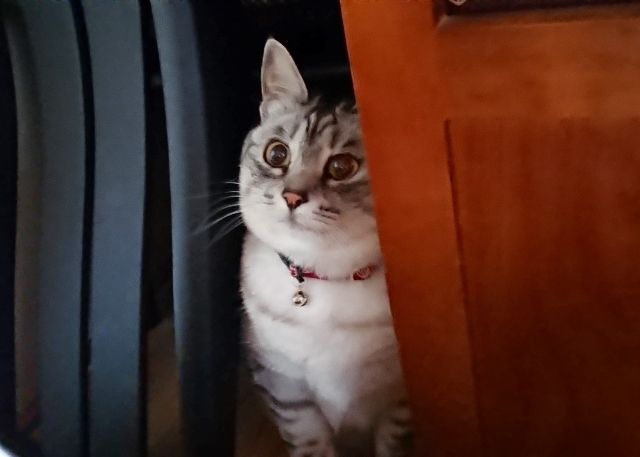 ただいま~~と帰ってきたら、にゃんずが「おなかすいたよぉ~~!!」ってお迎えに来てくれるかと思いきや・・・ぐんちゃんが遠くから、身を低くして玄関の私を見ている。いつもいそいそと来るミャーコは姿も見えない。リビングの戸を開けると・・・にゃんこの餌がっ!!!袋を破って、中身が食べられていた。「みゃぁ~~こぉ~」と呼ぶと脱衣所に隠れてて、恐る恐る出てきた。普通はカメラを向けると逃げるのに、餌の袋に視線を向けたまま微動だにしない。「あ、あれは・・・私じゃないわよ!」ぐんちゃんは最近、鰹節を振りかけないと餌を食べない。だから、こんなことをするのはミャーコしかいないのだけど。で、ぐんちゃんはというと・・・私を見て、「シャーッ!!」って威嚇した!!!昨夜はけーやんが来て餌をやってくれてるから、一晩ほっといただけで、この態度!しばらく、ぐんちゃんは私を避けてソファーの下から出てきませんでした。1泊くらい留守しても猫は平気、とか、あれは猫にもよりけりなんだよ・・・