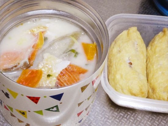 昨日の夜、鮭を入れて「粕汁」を作りました。でも一人分だけなんて作れなくて、まぁ、4人分くらいあったかな・・・で、今日はそれを温めてスープジャーに入れて持って行きました。保温になってるけど、冷めないようにさらに保温巾着&保温バッグにいれてね。ご飯は小さめのお稲荷さん3個。天王寺の商業施設の最上階にある従業員食堂は2人掛け、4人掛け、カウンターと座るところがあるの。でも、まぁ・・・どこに座っても、蓋を開けた途端、「ぷわぁ~~~ん!」って粕汁のニオイが!!殆ど冷めてなかったから、余計ニオイがね・・・隣の人に気を使いつつ、食べました・・・