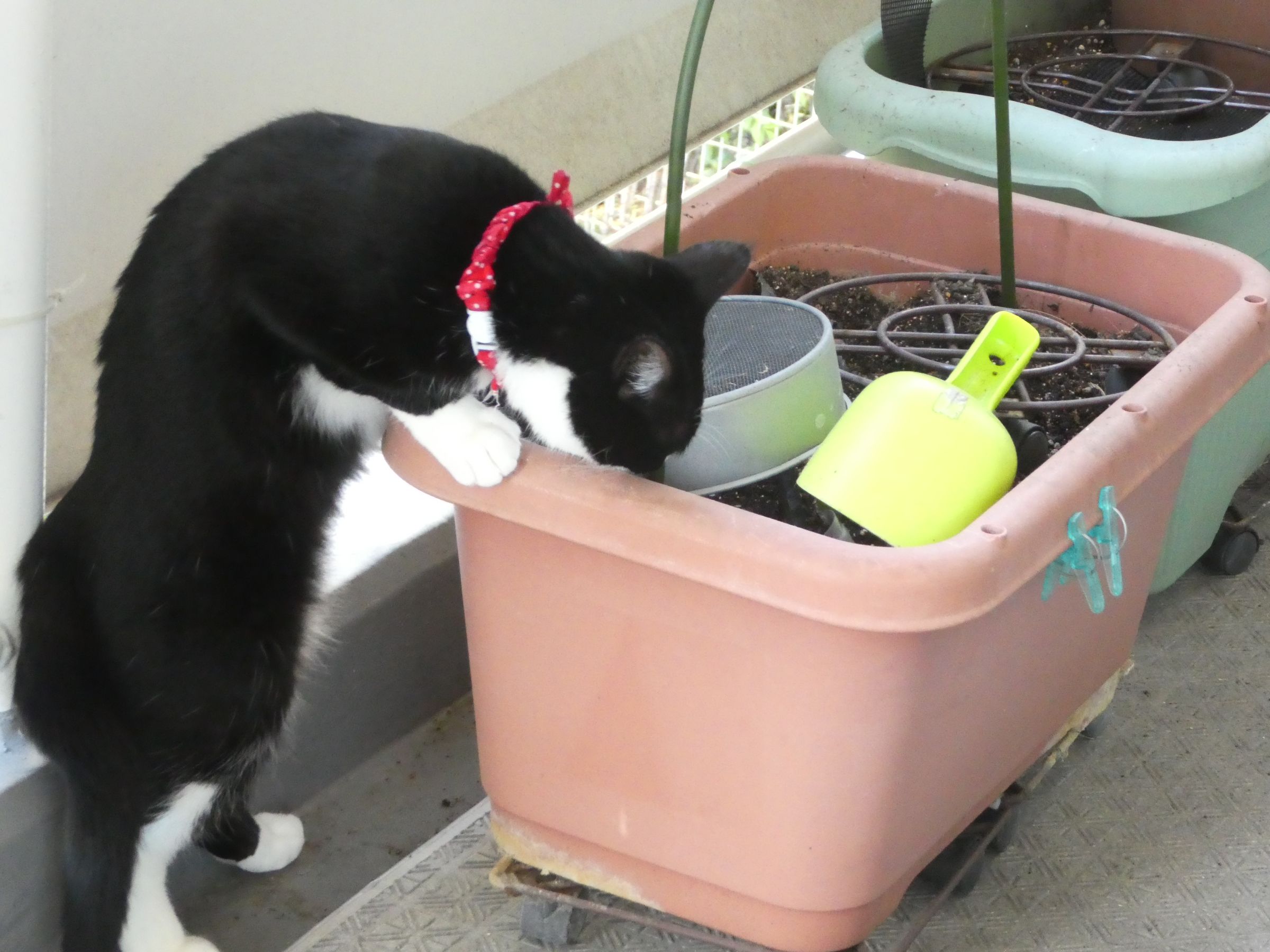 最近、ベランダ菜園の話がないな~って思ってる人、いる?実はね、もうあまり作ってないのよ。今あるのはイタリアンパセリとローズマリー、細ネギくらい。なぜかというと・・・コイツだ・・・ああー!!まだ入るか!?(右上のワイヤーが見えてるプランターは芽が出てきてるミョウガ)ぐんちゃ~ん!入るのやめてぇ!!プランターの中に入って、土は掘り返すわ、苗は踏み倒すわ、そこら中、土をぶちまけてるわ・・・もうやりたい放題!で、今冬はもう水菜や春菊、レタス類は植えてなかったのよ。でも、夏の日差しはやっぱり遮りたいからゴーヤだけは植えようと、先日から土を作って用意してると、もうさっそく、ぐんちゃんが入ろうとしてる!入られないように、土の上にいろんな障害物をおいてるのに、それも何のその!だ!コラコラ・・・ミャーコまで入らんでよろし。それにしてもデカい背中だ・・・