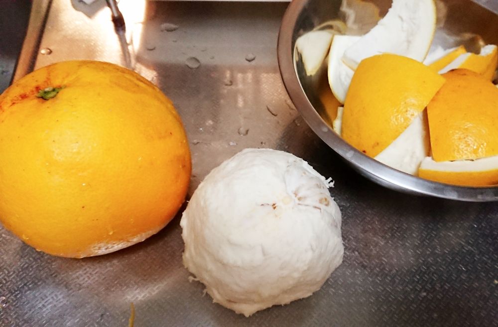 PCがイカレてた3月初旬のことなんだけど、年末にお節を届けたスタッフさんの実家から(瀬戸内の島)ミカン箱いっぱいの、いろんな種類のミカンが届いた。一人暮らしをしている娘を案ずるお母さんのお手紙と一緒に。子供っていくつになっても、親の心配の種なんだなぁ~ってつくづく思ったよ。その写真撮るのも忘れて、ミカンはいろんなところに配っちゃっけど・・・そういうお母さんの思いを大事にしたいなぁ~って思って、文旦の実は取り出してけーやんや、お店の若いスタッフにあげて、皮はピール(かんきつ類の皮を煮た砂糖漬け)にしてみました。皮も無駄にしたくないなぁって思ったんだよね。文旦って、赤ちゃんの頭くらいの大きさがあるけど、皮をむくと中は・・・ま、大きいんだけど、それほどでもない💦皮がけっこう分厚い。その分厚い皮を使ったピール。下ごしらえから、完成までにまる2日かかったわ。我が家にはにゃんずがいるから、猫の毛が付いたら困るので、乾燥はもっぱら冷蔵庫。これに1日以上かかったな~手をかけただけあって、苦みもそれほど感じず、美味しい文旦ピールが完成しました。2回に分けて大量につくったので、彼女や、お店のスタッフさんたちにもあげたよ。「昔、子供の頃に食べたのは、こんなんだった!」って喜んでもらえました。ちょっと甘いものが欲しい時にぴったりなおやつになりました。