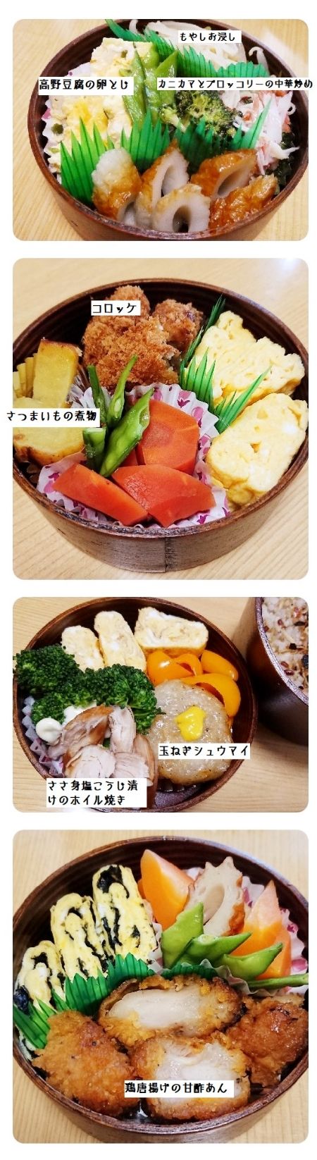 PCが使えなかった時のお弁当。ちゃんと作っていくときもあれば、おにぎりやお稲荷さんとお味噌汁だけ。ということもあって、そういうメリハリがお弁当持参を長続きさせる秘訣かな、と。何かよくわからないものには説明書きをしました。ブロッコリーの出現率、高い~和風の和え物だったり、中華風の炒め物だったり、シンプルにマヨネーズ乗せたりとか、いろいろですが。ブロッコリー、人参は固めに茹でて冷凍。麺つゆをまぶしてレンチン解凍で、1品出来上がり。さつま芋の甘煮も冷凍、玉ねぎシュウマイ唐揚げ甘酢あんも冷凍できます。前夜に冷凍庫から冷蔵庫に移して、翌朝、再度温めてお弁当に。味付けまで出来ているものは、アルミホイルに包んで冷凍保存袋に入れて冷凍していますが、それほど気にしなくても劣化していません。休日はこれらの作業で2~3時間潰れます・・・さて明日の休日は何を作ろうかな(あまり変わり映えしないけど)