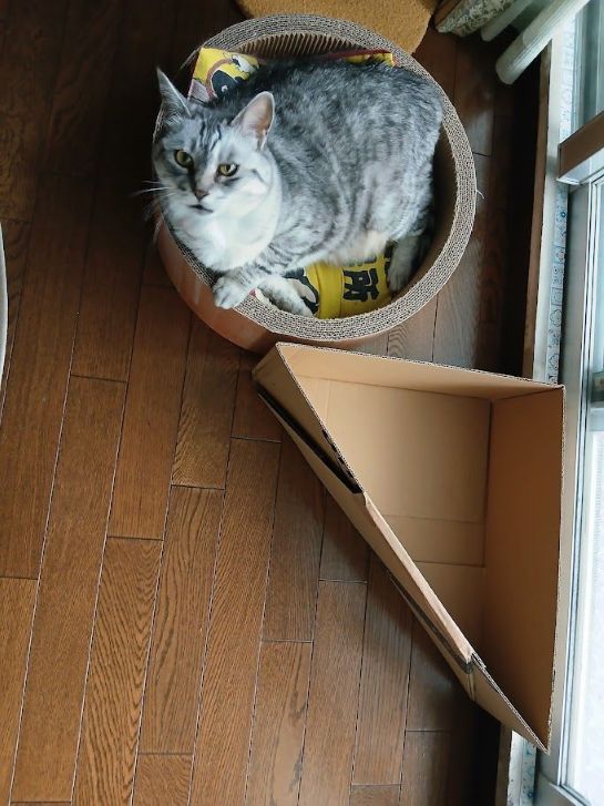 猫の身体は「粘度の高い液体」って言われてるので、三角の箱に入ると三角の猫になるのかな?と思って、四角の段ボール箱を改造して三角の箱を作ってみたんですが・・・全く入りません、見向きもしませんでした。用心深いぐんちゃんは猶更です。それよりも、ここ最近の暑さでこんな格好で寝転がっています。これはいったい・・・猫なのか?ってカンジですが