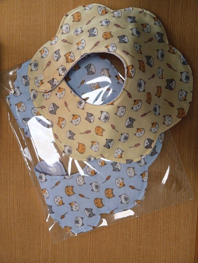 今年の1月に、姪っ子に生まれる赤ちゃんに、ってベビースタイを縫ったんです。ところがですね・・・3月に生まれた赤ちゃんは男の子だったんです!こども園でも3~4人、復帰した人も育休中の人も、全員女の子だったので、それで思い違いしたのかな~2枚とも花柄でね、これはちょっとアカンな・・・って。男の子用の柄の生地を買いなおして、でも、なんか縫う気が失せてしまってて・・・連休に入ってから水通しして、昨日、裁断して(これが一番時間がかかる)今日、やっと縫いあがりました!姪っ子、よだれかけを買わずに待ってるらしいので、ラッピングして、封筒に入れ、重さを計って195円の切手を貼って(ホントは180円で良い)スマホで集配時刻を確認し、3時前にポストに入れてきました!こういうことは早い!早い!木曜日には届くかな?なんかさ~男の子のを作るときって、ワクワク感がないのよねー生地の柄はあまり可愛くないし、メーターで買っても、残りを後で使う予定なんてなさそうだし、なので、Wガーゼの生地、全部100均で買いました!裏生地は孫たちのワンピースを縫った残り生地、薄いラベンダーカラーのWガーゼを使いました。やっぱりこういう色合いのほうが、縫っててもワクワクするよね~【数量5から】 生地 『Wガーゼ ねこ柄 水色 KTS3744-C』 COTTON KOBAYASHI コットンこばやし 小林繊維【先染め】ダブルガーゼ ジャガード ネコ柄 112cm幅【生地・布】KJQ01-1★数量3(30cm)から10cm単位【YUWA】Many Cats(ダブルガーゼ)猫 猫柄 ネコ ネコ柄 キャット にゃんこ ベビー ダブルガーゼ Wガーゼ ガーゼ生地 プリント生地 YUWA 【生地・布】919613 数量3(30cm)から10cm単位