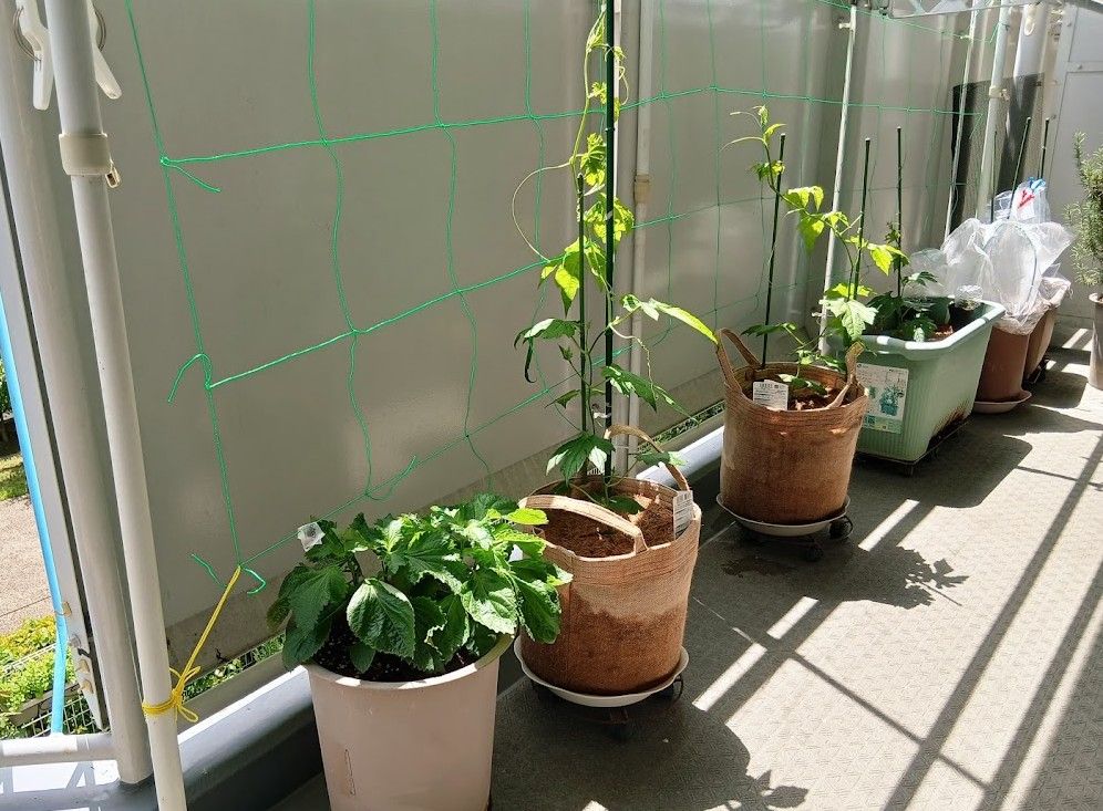 今日は朝のうちはヒンヤリとしてましたが、日が差してなかったので、日焼けの心配もなくゴーヤのネット張りをしました。一番手前は青じそです。普通のゴーヤの元気がイマイチなのが気になりますが、サラダゴーヤのほうはグングンと成長してます。ゴーヤってなんとなく南国の野菜だから暑いのは平気だろうと思うけど、38度を超すと成長が悪くなって葉焼けするんだって。去年の大阪は連日38度を超してて、ベランダの気温は40度以上になってたからこりゃ、不作になるのも仕方ないですね。今年は去年ほどじゃないけど、早い段階で高温になるらしいから、どうかなぁ~~