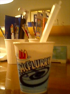 他の地域であるかわからないけど、大阪ミナミの「マクド」(あえて・・・)3店舗限定スイーツというのがあった。要するに、ソフトクリームに何かくっつけた感じの、大阪人の商魂が生きてる~ってなもの。普通のソフトクリームとサンデーに、このマックフルーリー(300円高っ!!!)ソフトクリームにオレオが入ったのと、コーヒー味のクッキーのと2種類ありました。こんなもん、買うかっ!と思いつつ、ついつい・・・うん・・・まぁ、おいしかったです。(素直・・・)