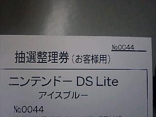 我が家にはサンタさんは来ない・・・はずだった・・・先週から色々悪事がバレて、パパもかなぁーりご立腹もちろん私も・・・「そんな悪い子じゃ、サンタさん来てくれないよ!」というと、「いねぇーよ!!!」だと・・・「なにぃ~? サンタさんは信じてる子のところにしか、来ないんだよぉー!!!」もう、ほんとにサンタさん来ないからっ!!!パパも「もう、今年は仕方ないんじゃないの?」と・・・でね・・・先週の半ば、近所の大型スーパーで先着100名様に「DS Light」販売!!!前日のお買い物で次男から、長男が実は「DS Light」を欲しがっていると聞いてしまった私。それまでは違うものだったじゃん(><)聞いちゃうとやっぱり、手に入るものなら、手に入れてやりたいのが親心。朝仮病して仕事休もうかと思ったけど、そこはやはり「良識アル大人」な私。ダメなら縁がなかったと諦める!!!お昼に仕事が終わり、ダッシュでお店へ。いやぁ・・・あるはずもございません。店員さんには「今頃、何?」みたいな顔をされ、心の中で「長男、ごめんよ・・・」とつぶやく母でした。その後、次男が病に倒れたこともあり、クリスマス自体がなくなるところを、なんとか次男の驚異的な回復力で難を逃れ、今朝・・・お店の開店から15分まで並んだら、「DS Light」を抽選販売すると・・・いつもはお昼近くまで寝ている私・・・なぜか起きちゃったんだよねぇー9時30頃。いいお天気だし、お出かけするし、お洗濯干して、夜の食事の支度しないといけないし、お出かけの支度しなきゃだし・・・あらあら、洗濯機は勝手に洗濯してくれるわ、顔洗って、歯磨きして、着替えたら9時50分。自転車で10分で着くわねぇ・・・到着^^;欲しい色別に並んだ。100台だから25台づつ?シロとクロはかなりの人気。すでに長蛇の列。ピンクは人気薄^^;長男はライトブルーのが欲しいとサンタさんへの手紙に書いてるばず・・・一か八か自分の、いや、長男の運に懸けてみることに。と、つぎつぎに人が集まってくる(><)15分って長い^^;お願い、もう締め切って!ついさっきまで、購入する意思などなかったはずなのに。子供たちには、今年はサンタさんは来なかったと言うはずだったのに・・・。自力で当てられるよう、家族総出で来ればよかったかなぁ・・・。他の人たちは、ほとんど一家総出だし・・・。おじいちゃん・おばあちゃん、赤ちゃんまで・・・お願いっ!1枚頂戴!!!でも、でも・・・当たるかどうかはわからないけど、もし、当たったら「サンタさん」からって・・・・「あっ・・・44番・・・縁起わるっ・・・」「いや、いや。44番はバースの背番号や!逆にコレは縁起ええんやっ!」「バースがんばれ!」かっとばせぇー!バ・ァ・ス!いったい私は何をしてんの?と、並んでから1時間。やっと抽選に。こういうのに並ぶとは不本意ながら、我ながら「親ばか」だなと・・・抽選はかなり公正に行われました。まず、希望の色別に並び、それぞれの抽選券の「お店控え」を自分で抽選箱へ。また、どの色から抽選するかも抽選で決め、アイスブルーは2番目^^;バースはいつでもホームラン^^やってくれました!最後から3番目だったけどね。補欠?キャンセルの人がいなければ当たらなかった私・・・でも、神様ありがとう。サンタクロースって、ほんとにいるのかも・・・ところで、次男の欲しいものって・・・???お手紙見せてくれーーーーー!!! あっ、パパにはコレ^^ポール・スミス デザインR・NEWBOLDのTシャツ2枚サプライズだったので、とっても驚いて、喜んでくれた^^よかった、よかった^^