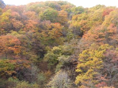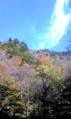 朝 ムスコから今朝から 台湾へ出張するとか「きっと うちの島の上通過するから 窓開けて黄色いハンケチ振るんやでぇぇっ」あいにく 昼前から大雨になり空見上げるのを中止なんや 首が凝ってます伊那日記の続きです夜更けまで喋り それから風呂へ旅の疲れもあってグッスリ寝込み目覚めは太陽サンサンと降り注ぐ頃ゆうべ四人で語らった居間覗いたら 誰も居ないのにストーブガンガンお宿の優しい心遣いに感謝よおく考えたら 昨夜は広い敷地の山荘にうちら夫婦二人ぼっちで過ごしたのだと後で知ることに 美味しい朝食 別棟で頂きその後 msk隊長先頭に山荘近辺の山散策そうそう 当日こちらで落ち合う予定のたくちゃん一家三匹のワン連れて ほぼ近くまで来てるとの連絡あり紅葉に少し遅いってことながら見事な山々の彩りについ感動の叫び声山荘にマス 岩魚釣りの池二つ 時期過ぎて動きの遅い鯉眺めてたらどこからともなく「ぶぅぅぅぅぅぅぅん」 きぇぇぇぇえええっ黄色と黒のストライプ模様まぎれもなく スズメ蜂の襲撃mskさん&ダンナとも 他人事のように「大丈夫 もう人を刺す元気ないよっ」そうといわれても久々の栄養たっぷり美人妻の訪問にスズメ蜂も大興奮してるんやろか!!いくら避けても 何度か近寄るしつこさmskさん ぽつり「ハチは黒いもの見たら クマと思って襲撃するんですよ」派手目の真っ赤なリュックと着ていたお洒落な黒色輸入品コート慌てて脱ぎ捨てたのゆうまでもなし山の散策終えて玄関に戻ると見慣れた車一台たくちゃん一家 昨夜大阪発って夜中爆走して到着の模様荷物の整理やら 釣りがしたいとゆうたくちゃん一家ほっといてうちらは今を盛りの紅葉狩へ行くことに途中 見覚えのある景色通過看板みたら高遠付近一昨年 桜の満開見学したものですmsk隊長お勧め 隠れスポットは必見の値打ちありました 写真撮ろうとして谷底みやるるばぁ・・・ 絶対降りること困難な川原に なにやら動物の足跡 ひぇぇぇぇええええっ蜂の攻撃逃れに隠れてたんやろか? 全山燃えるような赤 そして黄色たっぷり島にない美しい景色を堪能再び車に乗り込み途中 景観善き場所でmskさん奥様手作りのお弁当頂くことに 大きな五穀米握り 口に運ぼうとして唖然「えっ こんな柄のボタンつけてたやろかぁ」スススッと黒と黄色の縞模様ボタン移動「ぎゃああああああああっ 出たぁぁぁぁぁぁっ」
