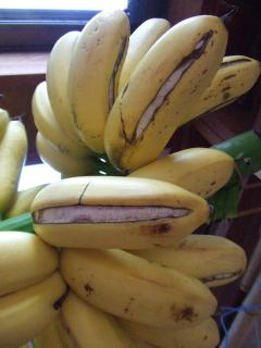 我が家の庭に成ってたバナナ樹成りのまま熟した色つき食べ頃かとまず一本ちぎってガブリ 「ひぇぇぇぇぇっ 渋っ!!」作り手ごろす様 渋さが自慢のナイスミドルそれが移ったんやろかぁ!!慌てて口から出して本体確認ダンナいわく「まだ食べるには早いけど実が詰まりすぎてパンパンで裂けてくてるんやなぁ」中身詰まりすぎて裂けそうなヨメ前にして失礼千万なお言葉 ふぅぅぅええええええええん ザックリ丸ごと切り落とし・・・ 記念写真撮って そのまま例の籠で完熟待つことに バナナブーム去って こんなけの量のバナナの消費思ってふぅぅぅっお待たせしました伊那の旅日記 はじまり はじまり・・・新宿から順調に走り想定外の早さで停車場に途中車内でその旨メールしたものの契約先が違っててSM返品くらいますどうせ早目のお迎えあるものとすぐさま諦めのんびり車窓楽しむことに人間想いは伝わらない時も多々停車場にそれらしき紳士の姿見当たらずがっかりこちらは他の客の食事時間とかちあってるのではと勝手な思いで躊躇してたもののなんや心配になり慌てて携帯で連絡電話に出られたmskさん「もう出前にでました」とは云わず「今からすぐお迎えに伺います 五分掛かりませんから!」なんやその声聞いてほっとします見るともなしにうらびれた?商店街眺めたら外人さん四人 チャリに石油ストーブ積んで移動中「すとーぶ さっぶい サブイ」話の内容からしてこちらの寒さ推し量られます直前の打ち合わせでmskさん此の地方の異常なまでの低温気候知らせてますお蔭でトランク 合いモノ&防寒着の二種類詰め込みパンパンのモノ三個東京から持参ほどなくmskさんの愛用ワゴン車目前に到着荷物の多さに驚かれた様子 垣間見れたものの初対面の挨拶もそこそこ慌てて荷物後方のトランクルームに搬入うちらまずワタシが乗り込み続いてゴロスさまところが・・・ワゴン車 なんでかドアの立てつけ悪くスムーズに動かず引けどもびくっともせん哀しさ夫婦二人で久しぶりの共同作業開始そんなとき急発進「ひえぇぇっ おっさんナニすんねん!!」まさか初対面のお方に怒鳴るわけもなし「あのぅ・・・ まだドアがしまってませんねんけど・・・・」慌てて車停車mskさん 飛び降りサイドに回ってドア確認お蔭さんでその時はめでたくドア閉まってましたが・・・車薄暮の町過ぎてややすると漆黒の闇手馴れた運転 真っ暗な村過ぎて・・・着いたところが山荘「暗くて ポロが見えなくて都合善いしぃ」ナニをおっしゃるうさぎさん!!室内 ゆったりとして懐かしい思いのする素敵な空間なにより 車到着するなり別棟食堂より笑顔満開で出迎えて下さった奥様の素敵な笑顔素晴らしい旅になるとの予想ばっちりの出会い場面でした山荘は一日一組限定で(翌日知りました)当夜の御馳走攻めにうれしい悲鳴 変わった食材 食感に「これ なんですのん」「ナニとおもいますぅ」正解ナニとおもいます?松茸の釜めし つい最近まで生きてた近くの牧場の牛くん 豚くん野菜もすべて山荘近辺で買いそろえた食材 地梢?地産そのものです折角の炭火伊豆で調達したサザエも並べ 大きなサザエは刺身に奥様 台所で絶叫「あぁぁぁぁぁ これって生きてるぅぅぅ」 オバちゃんの心 しっかりサザエに巻きついて!! 生きたまま焼いて大満足 四人 秋の夜長 おいしい食材頂きながら 話が盛り上がったのゆうまでもなし