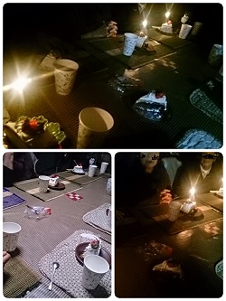 ゴルフ仲間の兄さん アネサマわが家に招待してクリスマスに お好み焼楽しむ会開催夏に行われたねんきん友の会ぎりぎり六位入賞して隣島に行く権利得た日チームメイト五名祝勝&反省会の宴席で決まった忘年会です当日 一人欠員できピッチヒッターに なんでか三人補充合計六名の爺婆さま相集っての宴ですシマの御年寄は超多忙最初なかなか皆様のスケジュール合わず一度は新年会に変更になりかけたもののやはり早くお好み焼たべたいと激しい要求受けて に開催決定こちらの都合温泉に行く時間もあるから六時に我が家に来るようにと固く云い聞かせて土曜日 練習グランドで生憎 昨日は朝から昼過ぎから豪雨雨の止み間みて温泉にてつの散歩はせいちゃんにお願いワタシは御馳走の仕上げにかかることに鶏の唐揚げ 餃子&納豆の餃子皮包み揚げ サラダの盛り付けの仕上げすること沢山ありすぎて・・・・そんな時 てつの鳴き声時計見たら6時15分前えええええっ なんでぇ!!玄関に三婆整列 にっこり「こんばんわぁ 今夜はアリガトー」可愛い笑顔みたら なんも言えませんけど「まだ 早いやん 六時過ぎてから 来いってゆうたじゃろがぁ」三人 すぐに家の中 チェック「善い家だねぇ ひろーーーい 薪ストーブも善いねぇ」あっこちゃんは初訪問さっちゃんは二回目いつも御馴染みのアネサマは五度目の訪問先輩風吹かせて あねさまのみっこちゃん さっちゃんがあっこちゃんに家ん中の説明「せいちゃんばぁ エライんだよっ この人は なんもしないんだからぁ口動かすばっかなんじゃから」いつもの口調で ワタシを悪者呼ばわり暫らくすると最高齢85歳のMさんAさん夫婦と参上これで役者が揃ったようで・・・さっちゃんは数の子入りの紅白なます Aさんは郷土の珍料理アネサマ・みっこちゃんの提案三婆は割り勘出費でクリスマスケーキ持参まずはで乾杯大吟醸酒で口火五合無くなったトコで郷土の焼酎に・・・女子は?ノンアルまずは持参したおかずでアルコールピッチ準備整い 本日のメーンお好み焼材料 プレートに順に並べて行くことにあっこちゃん「あらっ まぁ 荒い並び方だこと!」「けど ブスだったのが 別嬪になっていってるぅ」つい「外野 やかましーっ」ゆうてる間に お好み焼き完成人数分にふりわけて 仲良く「ふぅふぅ」「美味しいねぇ」 「呼んでもらってよかったよ」感謝の言葉が心地よいせいちゃんは ゆっくり食べるはずもなく薪ストーブの管理に忙しいいつもだと宴会の御馳走 に撮るのがお約束けど・・・・忙しすぎてカメラ取りに行くのも忘れ果て・・・皆で大笑いしながら食事終え続けてデザートに長老のMさん 普段は食が細く 悪酔いされる傾向大とかで心配したものの出したもの全て平らげて酒飲みなのにケーキも・・・・ショートケーキにローソクついてなくて仏壇用でも善いかとおもったけどさすがに・・・さぁりぃ滞在時に残ってたカラー蝋燭見つけてやれやれ 三本しかなくて歳の順 上位?三人のケーキの上でアカアカ すぐに全員完食まだ モノ足りない顏してるからAさん持参の回転焼饅頭四個半分コにして・・・・豆から擦った出してあげたらみなさん ミルク 砂糖無しのブラックで・・・・愉しい時間はあっとゆう間に時計見たら 10時回ってて最後に土産用としてお好み焼各一枚ずつ焼いたげて解散することにみなさん 大満足で帰って行きました当夜の会費 さて いくら?